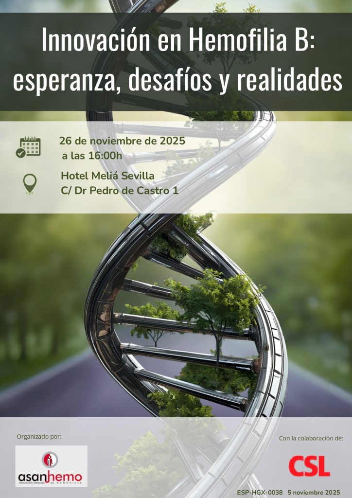 Asanhemo te invita a una jornada dedicada a la terapia génica en Hemofilia B, que tendrá lugar el 26 de noviembre de 2025 · 16:00 h, en el Hotel Meliá Sevilla – C/ Dr. Pedro de Castro, 1